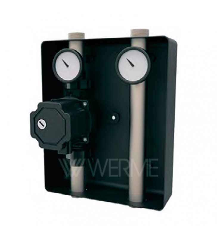 Компактная насосная группа в пластиковом корпусе и изоляции из вспененного каучука. Укомплектована двумя термометрами для измерения температуры на подающем и обратном трубопроводе, обратным клапаном и соединительными стальными оцинкованными патрубками. По желанию покупателя может быть доукомплектована насосами TacoNova, Grundfos или Wilo
